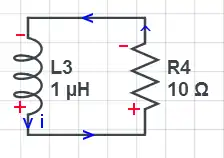 The discharge circuit was marked up with the final directions and polarity of everything. But the terminal relationship for the inductor had to have a negative sign in it because the voltage and current directions did not follow the positive sign convention.