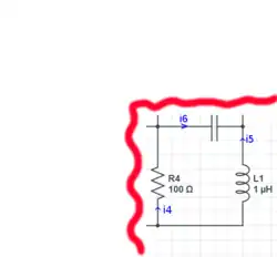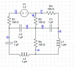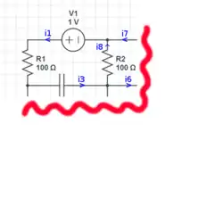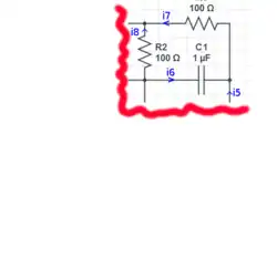Original Circuit5 junctions or nodes colored in, sacrifice one, 4 junction/node/cut set equations can be writtenLabeling the currentsCut set that results in an equation different than a tradional node: i6-i7-i2-i4=0 Cut set that results in an equation different than a tradional node: i1-i3-i4-i5=0 Cut set that results in an equation different than a tradional node: i3-i2-i8-i7=0