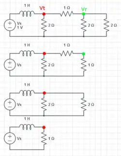 Because the current is split in half has it goes through the resistors, the total current is twice that of i_{TR}: