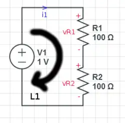 example 1 circuit marked up with voltages and currents, 1 loop and no junctions