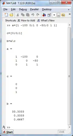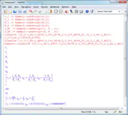 MuPAD is then given the values of the constants and asked to re-evaluate the linear equations. This generates the symbolic solution in terms of fractions and symbols like .