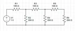 Find everything. Solve with the source represented by the symbol and with the 100 ohm resistors represented by the symbol R and the 200 ohm resistors represented by the symbol 2R. Then solve numerically.