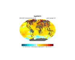 The map at right shows an expression of the directly measured temperature change. It shows the temperature anomaly map averaged over the ten years spanning 2000 to 2009 in Kelvin (a centigrade scale, just like Celsius). These anomalies are with respect to the 1961 to 1990 base period. The measurements that go into the HadCRUT3 data set include observations over land from more than 3000 weather stations on at least a monthly basis. For ocean areas, ship-based measurements are used, details are included in published papers (Jones & Moberg 2003 and Rayner set al. 2003).