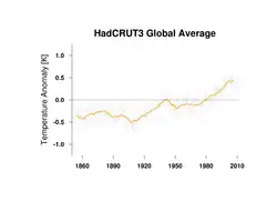 The time series from the HadCRUT3 data set is also shown at right. While temperature anomalies are fairly uniform in the late 19th Century, the 20th Century shows a strong upward trend. The trend is divided into an early rise from around 1900 to about 1940 followed by a period of little warming (and some cooling) until the 1970s and then a rapid rise from before 1980 until present. These three periods are understood as being driven by different forcing agents. The early 20th Century warming was caused by both increasing carbon dioxide and increasing solar activity. The mid-century cooling and stable period follow rapid industrialization and World War II, and the industrial activity following the war injected an abundance of particles into the atmosphere. These particles, called aerosol, reflect sunlight, which lead to a so-called "global dimming" which decreased the sunlight reaching the surface, thereby reducing the global temperature. The later warming, after 1980 or so is dominated by carbon dioxide, which became a stronger forcing agent than the dimming aerosol as air pollution became more strongly regulated while carbon dioxide continued to rise. (reference [[3]])