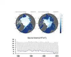 While the above examples show evidence for the temperature change in the 20th Century, recent climate change is expressed in numerous other climatic indicators. One example is the extent of Arctic sea-ice. As the climate has changed over the past few decades, there has been an unprecedented decline in the area covered by sea-ice in the Arctic Ocean, especially late in the warm season which is also the sea-ice melt season ( Kinnard et al. 2011 ). The most direct way available to track these changes uses satellite observations. The figure at the right shows observed Arctic sea-ice concentration (in percent) for September 1979 and September 2010 from a set of passive microwave observations [NSIDC] These two months show an example of the change in coverage of sea-ice in the Arctic Ocean: September 2010 shows substantially less ice than 1979. September is the end of the melt-season, so these maps are an illustration of the minimum sea-ice coverage in these years. The time series below the maps show the monthly mean sea-ice extent from late 1978 through 2010. Sea-ice extent is the area covered by sea-ice concentration of at least 15%. The annual cycle of sea-ice extent is quite large, oscillating between 15 and 6 million square kilometers in most years. Looking at a particular month shows the long-term trend more obviously. The blue line in the time series plot highlights September sea-ice extent, and it is clear that there is a decline in the September sea-ice minimum. Both the concentration and the extent are an expression of the area covered by ice, but at least as important is the volume of sea-ice. Observations show a pronounced decline in sea-ice volume, similar to the decline in sea-ice extent. The volume is decreasing in the winter months even more strongly than the extent is; this is because the ice that forms in the winter is thin and has less and less volume as the thick ice (that survives through the summer) disappears.