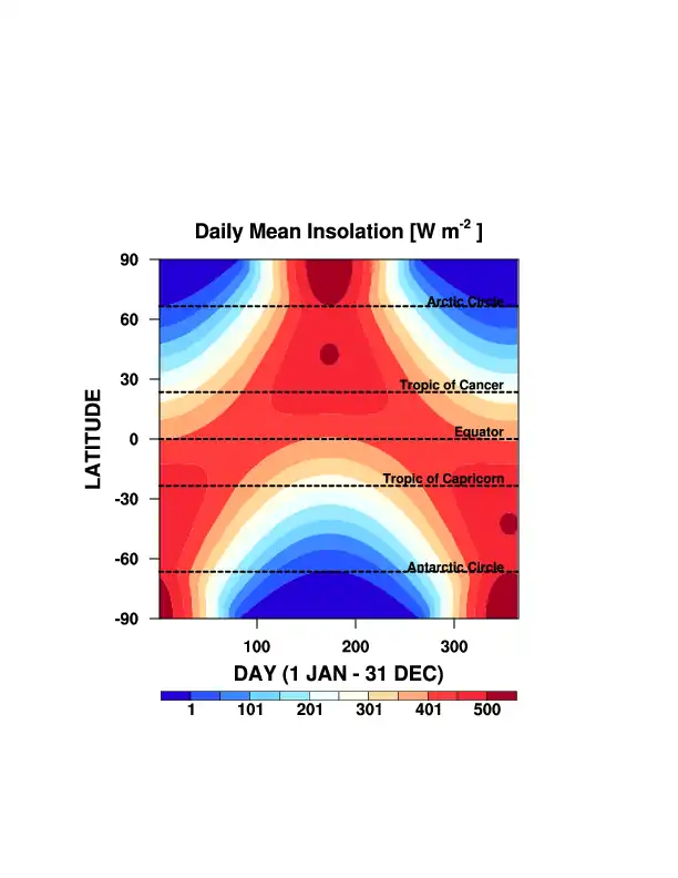 Sun-Earth System should make it clear that the geometry of the Sun-Earth system plays a key role in how much sunlight reaches Earth and where it arrives. This section briefly describes the pattern of incoming solar radiation, or insolation, over the course of the year. This pattern is the direct result of the geometrical factors described above, and since the insolation is the energy source for the entire climate system, where the energy enters the system is of fundamental importance to the subsequent distribution of energy. That is to say, where the sun shines has a direct impact on weather and climate.