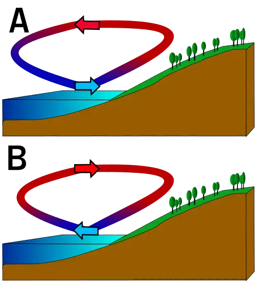 A: Sea breeze (occurs at daytime), B: Land breeze (occurs at night)