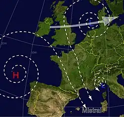 It is a cold and dry wind which blows in the Spain and France from North-west to South-East direction, mostly occur during winter months.Due to the presence of the Rhome River, these winds are channelized into the Rhome valley due to which they become extremely cold. they pass through the narrow Rhome Valley, they turn into stormy northerly cold winds and their average velocity which is 55-65 km/hr to 128km/hr.
