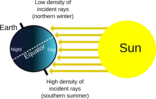 This diagram shows how the tilt of the Earth's axis aligns with incoming sunlight around the winter solstice of the Northern Hemisphere. Regardless of the time of day (i.e. the Earth's rotation on its axis), the North Pole will be dark, and the South Pole will be illuminated; see also arctic winter. In addition to the density of incident light, the dissipation of light in the atmosphere is greater when it falls at a shallow angle.