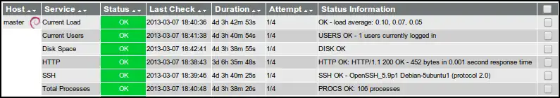 Figure 4.2 shows the service status details for these plugins on the master node. Getting Icinga to monitor remote hosts (the worker nodes) required much more configuration. A look into the configuration folder of Icinga revealed how the master node was configured to display the information of figure [fig:default_plugins]. Information is split into two parts: host identification and service specification. The host identification consists of host_name, address and alias. A service is specified by a host_name, service_description and a check_command. The check_command accepts a Nagios plugin or a custom plugin which has to be configured in another Icinga configuration file: commands.cfg.