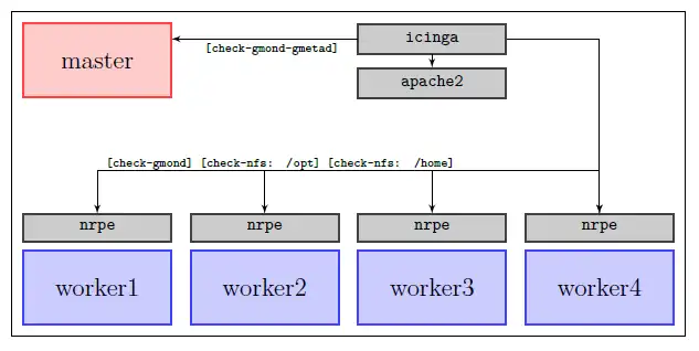 The question of how to achieve a setup as presented in figure 4.4 now arises. We want to use Icinga to monitor our worker nodes. For that purpose Icinga provides two different methods, which work the same way but use different techniques. In either case the Icinga running on the master node periodically asks the worker nodes for data. The other approach would have been, that Icinga just listens for data and the worker nodes initiate the communication themselves. The two different methods are SSH[4] and NRPE.[5] In the manuals both methods are compared and NRPE is recommended at the cost of increased configuration effort. NRPE causes less CPU overhead, SSH on the other hand is available on nearly every Linux machine and thus does not need to be configured. For our purpose decreased CPU overhead is a selling point and therefore NRPE is used. The next sections describe how Icinga has to be configured to monitor remote hosts with NRPE.