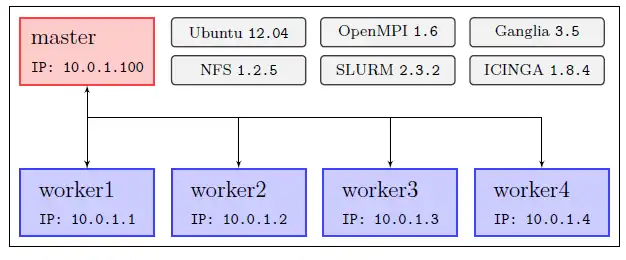 Figure 4.1 provides an overview of both the used cluster (of virtual machines) and the used software. All nodes use the most current Ubuntu LTS[1] release. In the case of Ganglia the software version is 3.5, the most current one and thus compiled from source. For Icinga version 1.8.4 is used.