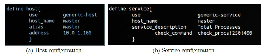 Figure 4.3 shows some important parts of the modified default configuration file used for the master node. As it can be seen both the host and service section start with a use statement which stands for the template that is going to be used. Icinga ships with a default (generic) template for hosts and services which is sufficient for us.