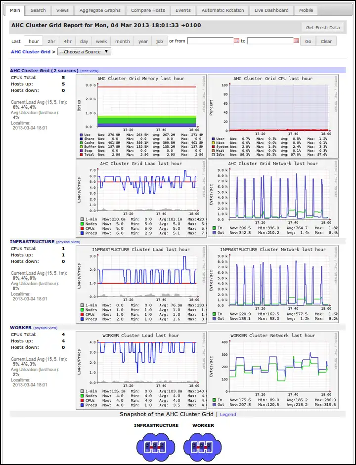 Ganglia is an open source distributed monitoring system specifically designed for high performance computing. It relies on RRDTool for data storage and visualization and available in all major distributions. The newest version added some interesting features which is why we did not use the older one provided by the official Ubuntu repositories.