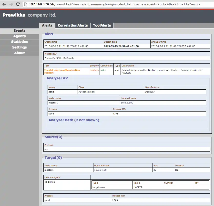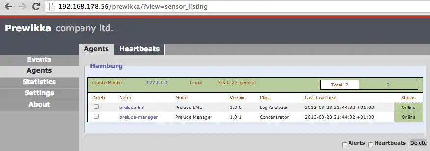 We use Prewikka so that our data, the Prelude Manager collects from all its sensors, are clearly displayed in a graphical web interface. Here we get all the needed information that can also be found in the Prelude Manager database. In our case, we have only registered the Prelude Manager and the Prelude-LML sensor, which currently reads the auth.log file of the system.