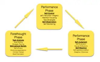 Zimmerman’s Cyclic SRL Model divides self-regulated learning process into three distinguished phases: forethought phase, performance phase, and self-reflection phase. The forethought phase refers to processes and beliefs that occur before efforts to learn; the performance phase refers to processes that occur during behavioral implementation, and self-reflection refers to processes that occur after each learning effort.[2]