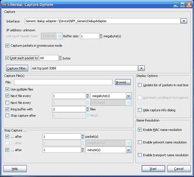 - Options: This the most important of all the dialog boxes. This menu item brings up the Capture Options dialog box and allows you to start capturing packets. It has all the main options that are required for any packet capturing. It allows you to capture data in promiscuous mode, assign some capture filter, specify capture file where captured packets are to be stored, specify name resolutions and lot lot more. The capture options window is self explanatory and guides you through the various options and gives information about them. The options window is shown below.