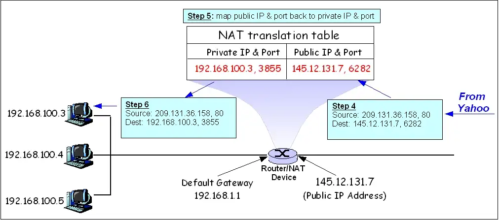 The reverse process is similar to the original translation process. It will look up the translation table for the corresponding private (IP addr, port) pair when given the public (IP addr, port) pair. The only difference it that a missing entry will result in the packet getting thrown away. Once the lookup and alteration is completed (step 5), the packet (now contains the original private (IP addr, port) information) is sent to the requesting host at 192.168.100.3 port 3855.