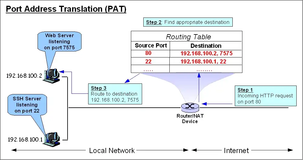 all incoming requests to port 80 of the router are forwarded to internal host 192.168.100.2 port 7575. Likewise, all incoming connections to port 22 or the router are redirected to host 192.168.100.1 port 22. This type of setup is common for users to wish to run a server behind a NAT device. The only down side to PAT is that it's restricted to one entry per router port.