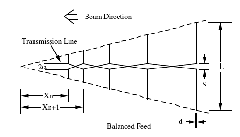 The bowtie antenna is formed of two triangular sheets connected to a transmission line and provides a 3 dB gain over a simple dipole. It can also be constructed of a wire mesh if the spacing is less than 1/10 wavelength. The input impedance is a function of length and flare angle. For television applications, the flare angle a is between 60o and 80o. If the antenna is mounted ¼ in front of a reflecting surface, the gain increases to approximately 9 dB. Stacking two of them vertically one wavelength apart, increases the overall gain to about 12 dB.