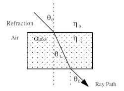 When a light ray passes through a glass block, it is refracted twice. If the block has parallel faces, the ray will resume it original angle of attack but is slightly displaced.