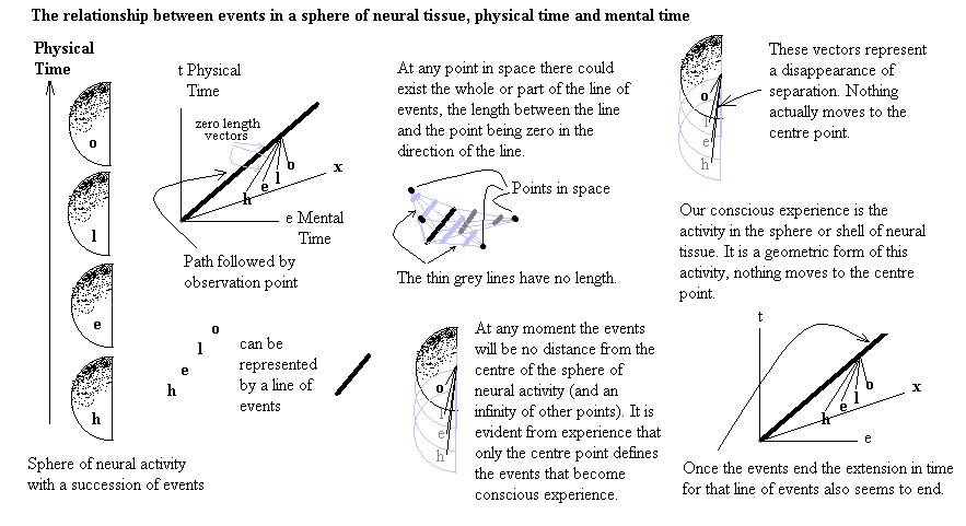 experience is all those events that have coordinates (x,y,z,b,e), not those events that have coordinates (0,0,0,0,0). This means that experience is a set of events laid out in a framework that has remarkable properties. It has a 'negative' dimension (b) that allows places where separations in both time and space are zero. The framework has a geometrical duality where the same events are at a point at an instant and 'out there', spread out in the time and space of the brain.