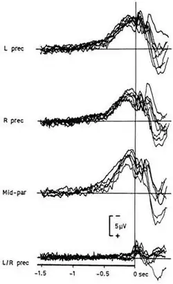 In 1964 Kornhuber and Deecke performed a series of experiments that measured the electrical activity from the scalp (EEG) during voluntary actions. They averaged many EEG's from subjects who were about to move a finger and discovered that there is an increase in scalp potential before the movement takes place. The increase in potential can start as long as 2 seconds or so before the movement and is known as the "readiness potential" (Bereitschaftspotential). The readiness potential is strange because it seems to contradict our conscious experience; we do not decide to move a hand and then wait 2 seconds before the hand moves. It seems that the non-conscious brain may be taking things into its own hands.