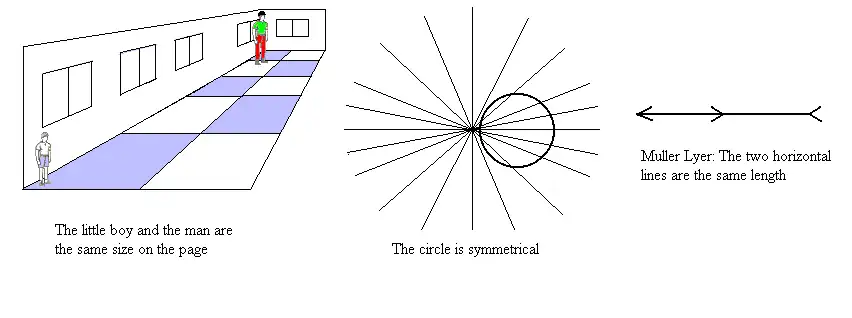 Our dreams are clearly models that form a 'dreamworld' but the idea that perception might be like a dream that is updated by sensation is not so obvious. Experience seems to be an active model of the world (virtual reality) based on sense data rather than a simple mapping of retinal and other sensory data. This is demonstrated by visual illusions such as the Ames Room, Spoke Illusion and Muller Lyer illusions shown below: