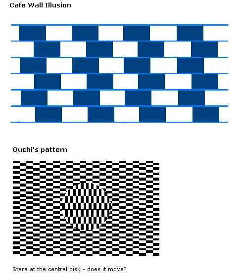 Notice how the circle is distorted without any distortion in the 'spokes', it is as if the circle has been treated as a separate object by the processes in the brain that rearranged it. In all of these illusions the brain has rearranged large areas of the visual field and has managed the input as a collection of 'objects' that are manipulated separately. Even movement seems to occur in some figures showing that the brain models the position of things:
