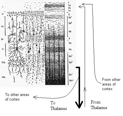 Histologically the cerebral cortex is a layer of greyish neurons overlying a huge mass of white nerve fibres, the cerebral medulla. The cortex consists of six main layers. The upper layers receive input from the relays in the thalamus such as the lateral geniculate, from the thalamus in general and from other areas of cortex plus a few specialised inputs from other locations. The lower layers give rise to output fibres that largely connect with the thalamus and other areas of cortex although particular specialised processors in the cortex may also have direct connections elsewhere such as to motor nuclei.