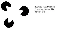 The consciousness of the completion of Kanizsa figures in blindsight patients is particularly indicative of the preservation of the field even though the content was largely missing. A Kanizsa figure is shown below: