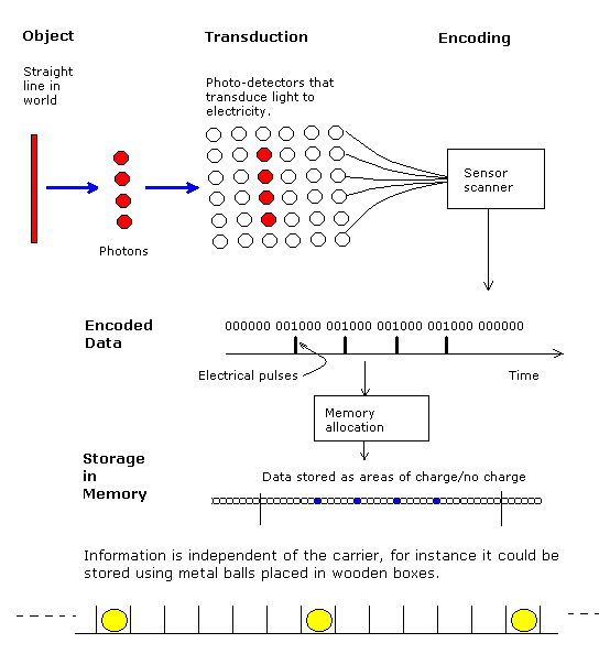 Information systems in general have transducers that convert the state of signals in the world into signals impressed on another carrier, they then subject these signals to various processes and store them.
