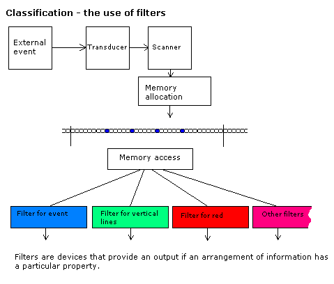 Classification is performed by information systems and by the information processing parts of the nervous system. A simple classification is to sort symbols according to a set of rules, for instance a simple sort classifies words by letter sequence. There are numerous classification systems in the visual system such as arrangements of neurons that produce a single output when a particular orientation of a line is viewed or a particular face is seen etc. The processes that identify attributes and properties of a thing are usually called filters.