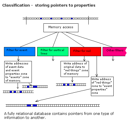 A database is a collection of signs. A fully relational database is a database arranged in related sets with all relationships represented by pointers or connections. In conventional usage a relational database is similar but more sophisticated, redundant relationships and wasteful storage being avoided. Conventional relational databases obey "Codd's laws". An hierarchical database only contains pointers that point from the top of a classification hierarchy downwards. Events and persistent objects are also known as entities, the output of filters related to entities are known as the attributes of the entity. In practice a system requires an event filter to record an entity (in a computer system the event filter is usually a single data entry form and the attributes are filtered using boxes on the screen to receive typed input).