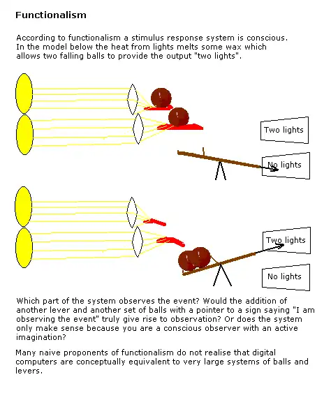 This argument also occurs when the physical structure of computing devices is considered, for instance a computing machine could be constructed from rolling steel balls. Would the steel balls at one instant possess the quale 'blue' and then, as a result of the movement of one ball to another position, possess the quale 'red'? Can an arrangement of balls really have qualia or are they absent? It is incumbent upon proponents of functional organisation to describe why identical balls arranged as O O OOO can be the quale red and yet those arranged as OOO O O can be the quale blue. They must also take into account Kant's "handedness problem": the balls OOO O O look like O O OOO when viewed from behind. Red and blue, as arrangements of things, would be identical depending on the viewing point. How can a processor have a viewing point when it is itself the steel balls?