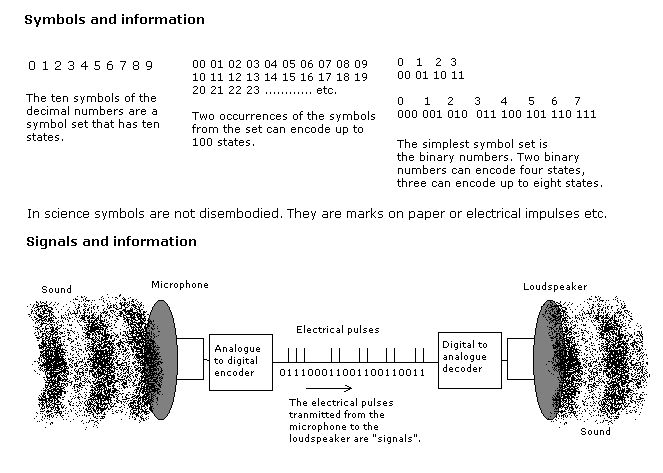 The binary system is useful because it is probably the simplest encoding of information and any object can represent a binary "1". In electrical digital systems an electrical pulse represents a "1" and the absence of a pulse represents a "0". Information can be transferred from place to place with these pulses. Things that transfer information from one place to another are known as "signals".