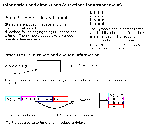 Information is encoded by changes of state, these changes can occur over time or as variations in density, temperature, colour etc. in the three directions in space. The writing on this page is spatially encoded.
