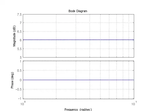 Because the gain value is constant, and is not dependent on the frequency, we know that the value of the magnitude graph is constant at all places on the graph. There are no break points, so the slope of the graph never changes. We can draw the graph as a straight, horizontal line at 6dB: