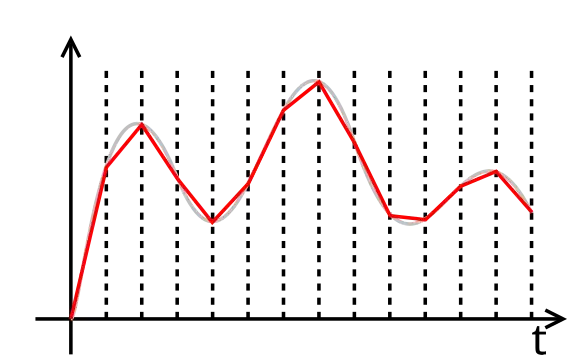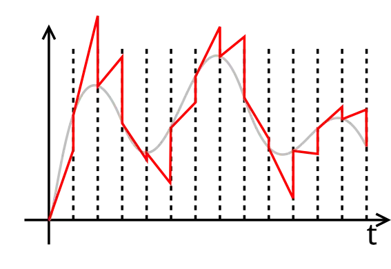 Consider a sampler device that operates as follows: every T seconds, the sampler reads the current value of the input signal at that exact moment. The sampler then holds that value on the output for T seconds, before taking the next sample. We have a generic input to this system, f(t), and our sampled output will be denoted f*(t). We can then show the following relationship between the two signals: