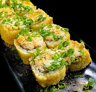 Acevichado sauce is a recent contribution to Peruvian cuisine that highlights the country's blend of several cultures, including the Japanese diaspora at the end of the 19th century. The recipe is said to have originated during the 90s in Lima's Matsuei restaurant, which is famous for the creation of the iconic acevichado maki. The sauce, which is sometimes described as a "Leche de Tigre mayonnaise", references the Peruvian style of uramakizushi and has undergone several changes to this day. It is commonly used as a Nikkei-style sushi topping, but more recently, it is used for dipping mixed seafood fritters (jalea de mariscos) and even pizza or chicken wings!