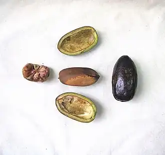 The fruit is smooth and deep green to black when ripe. The inner flesh is greenish-yellow and high in both fats and protein, similar to that of an avocado.[1]