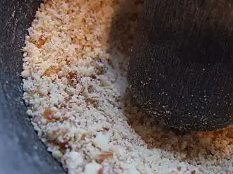 Almond flour or almond meal refers to finely-ground almonds.[1] It is usually made with blanched almonds, although it can include the skins. Almond flour is commonly used in pastry to give a nutty flavour.