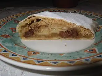 - For the apple strudel of the old-Viennese style, ¼ L sour cream or slightly whipped cream, and 80 g coarsely chopped nuts are added to the original recipe before the strudel is rolled up.