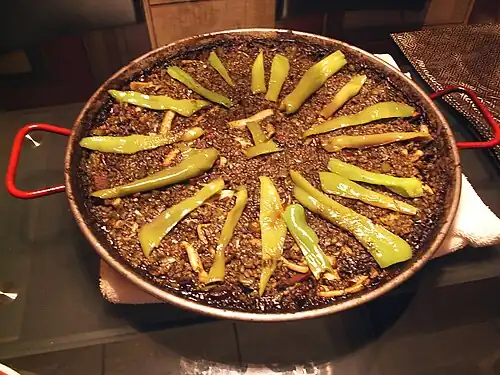 Arroz negro or arròs negre ("black rice" in Spanish and Catalan respectively) is a Valencian dish of cuttlefish (or squid) and rice which is very similar to seafood paella. In fact, some call it paella negra (black paella in Spanish).