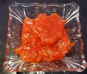 Asoka halwa is a very famous dessert in the district of Thiruvaiyaru in Tamil Nadu, India. The traditional dish is made with moong dal, sugar, and ghee, and it is served at wedding ceremonies.