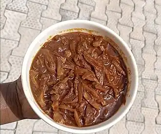 - Heat a small amount of palm oil in a pot. Add the blended mixture along with the ashwe leaves and beef.