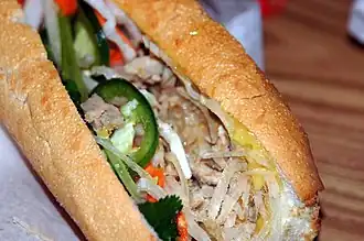 Bánh mì means 'bread' in Vietnamese, and it often refers to a type of Vietnamese sandwich. It may have started as a 'kitchen sink' recipe in Vietnam, where various leftovers would be tossed into a sandwich to finish them up (like a po' boy). Bánh mì is now sought after by many for its unique and delicious flavors. There are many different types of bánh mì sandwiches, ranging from chunked BBQ grilled pork, sliced pork pâté, and shredded grilled chicken, to grilled and smoked fish, sardine, meatball, Chinese-style sausage, and tripe.