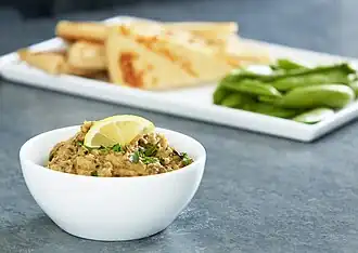 Baba ganoush is a common Middle Eastern and Mediterranean dip with a creamy, somewhat smoky flavor. It is usually eaten with pita bread although naan or a crispy flatbread also work well.
