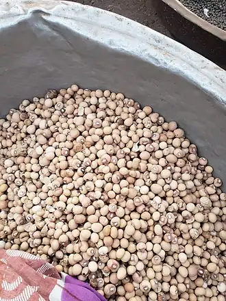 Bambara beans, like peanuts, grow underground in pods.[1][2] They are small and rounded,[3] and their color can range from tan to brown to red.[1] After the pods are harvested, they are allowed to dry in the sun. They may then be threshed or sold in pods.[3] The soft and immature bean can be eaten fresh, but fully mature seeds become hard and require processing such as boiling or grinding to flour.[3]