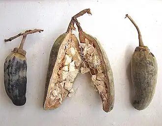 Ripe baobab fruits are large, dry, brown pods. When cracked open, the seeds inside are surrounded by a dry powdery pulp that is both tangy and sweet.[1][2] The seeds are nutty and almond-like in flavor.[3]